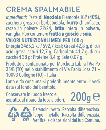 La spalmabile di Casa Marchetti: golosa e genuina come il gelato di Alberto. La polvere di latte è 100% piemontese, la nocciola è Piemonte IGP. autentica come le Langhe.